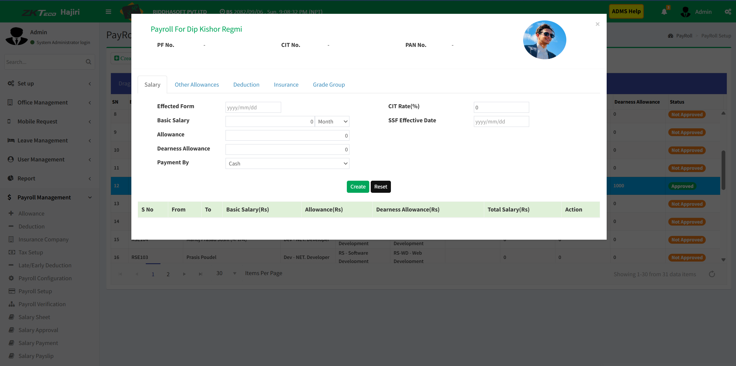 A robust HR and payroll solution featuring real-time biometric synchronization via ADMS for seamless workforce management and reporting.